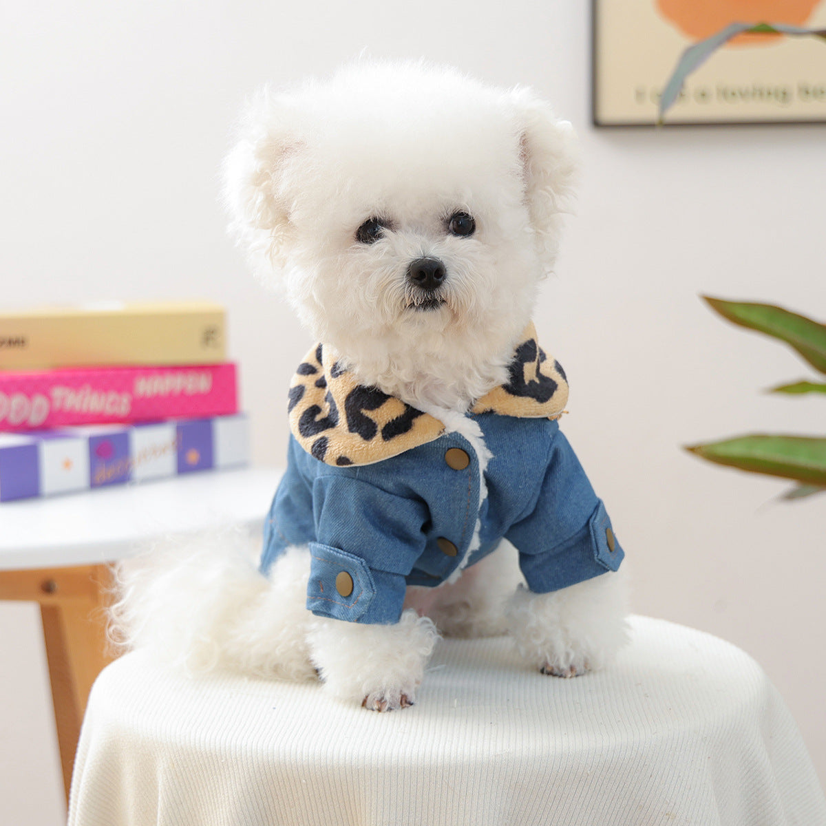 - Color: Washed Blue Denim with Leopard Print Collar