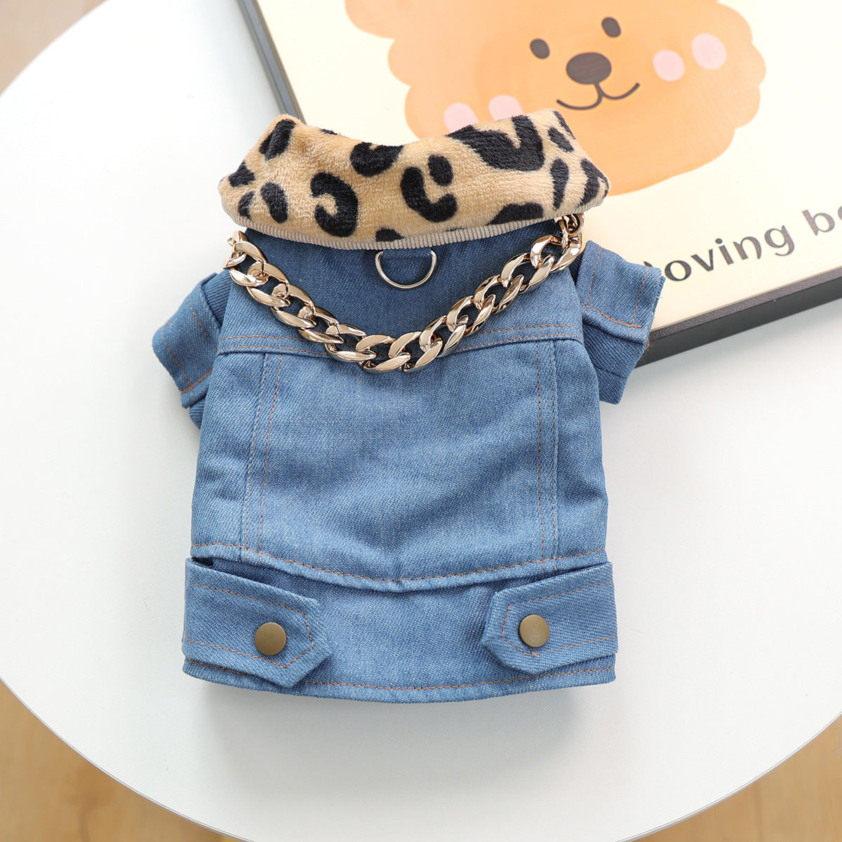 - Design: Classic denim jacket enhanced with leopard-print details and gold-tone chain accent