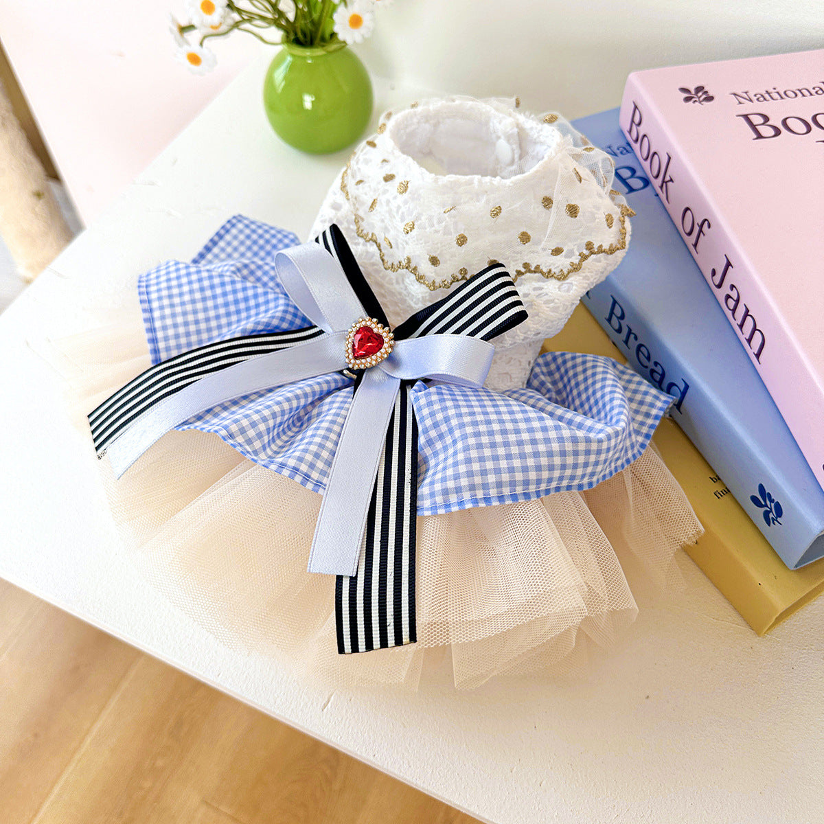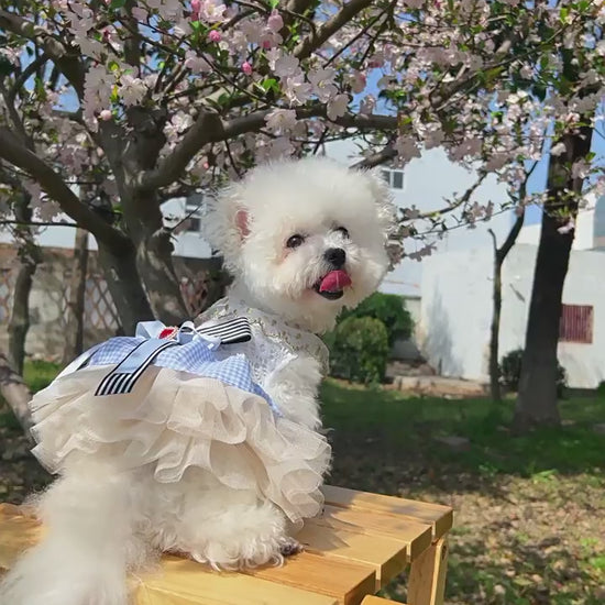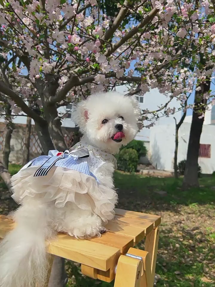 Step into a fairytale with the Kumago® Wonderland Tulle Dress, an enchanting piece of luxury pet couture. Inspired by whimsical fantasy, this dress combines intricate lace, soft tulle layers, and a gingham skirt with a statement bow adorned with a jeweled heart. Designed for pets who deserve nothing less than extraordinary, it’s the perfect blend of elegance and playfulness.
