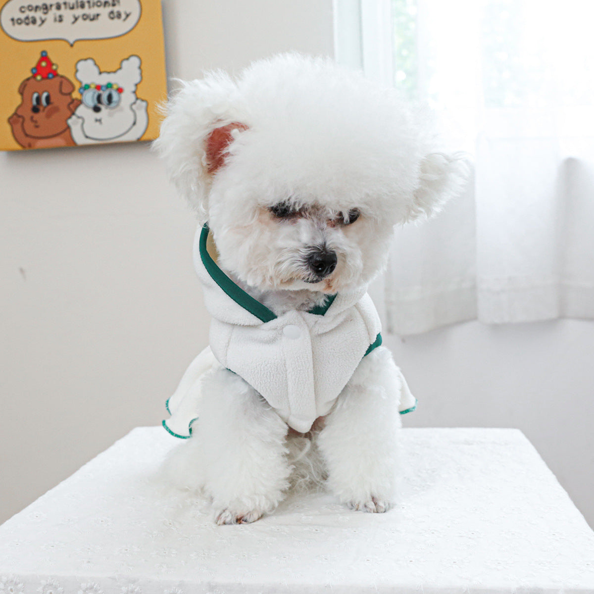 The Kumago® Tennis Court Dress combines sporty elegance with playful charm, perfect for pets who enjoy an active yet stylish lifestyle. Crafted in soft premium fabric, the dress features a crisp white base, green piping accents, and a pleated skirt inspired by classic tennis uniforms. The embroidered crossed racket motif adds a chic finishing touch.